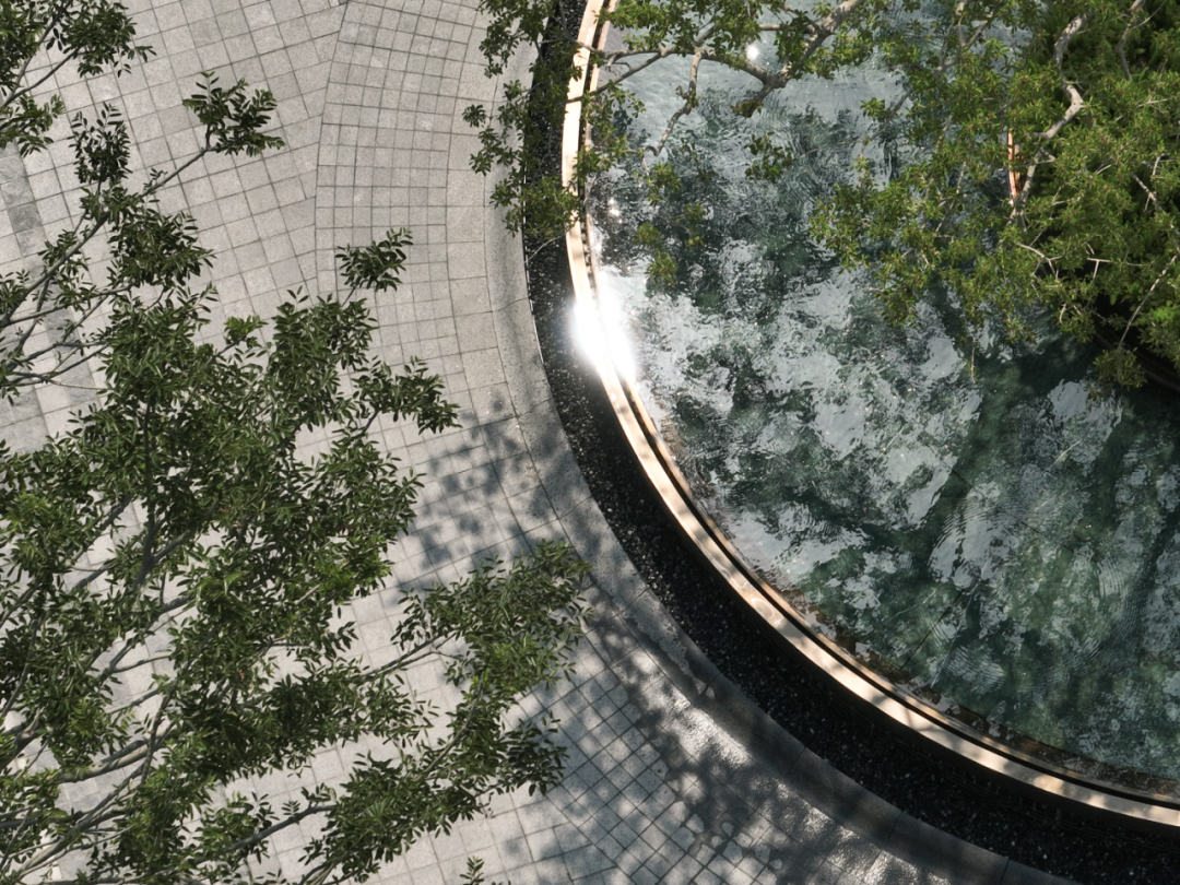 设计师们以水为媒介,凭镜借景,以池映景,在虚实之间通过对空间的组织和创造,营造景观的秩序与高定精致感。 Designers use water as a medium, borrow scenery through mirrors, and reflect scenery through pools. By organizing and creating space between reality and virtuality, they create a sense of order and high precision in the landscape.
