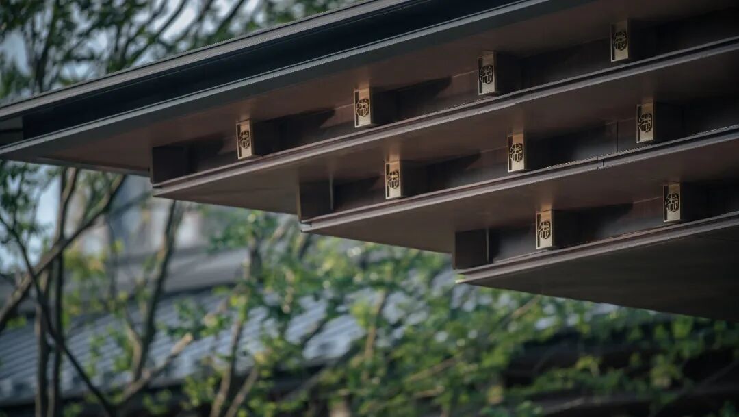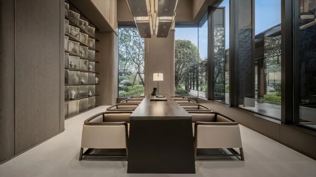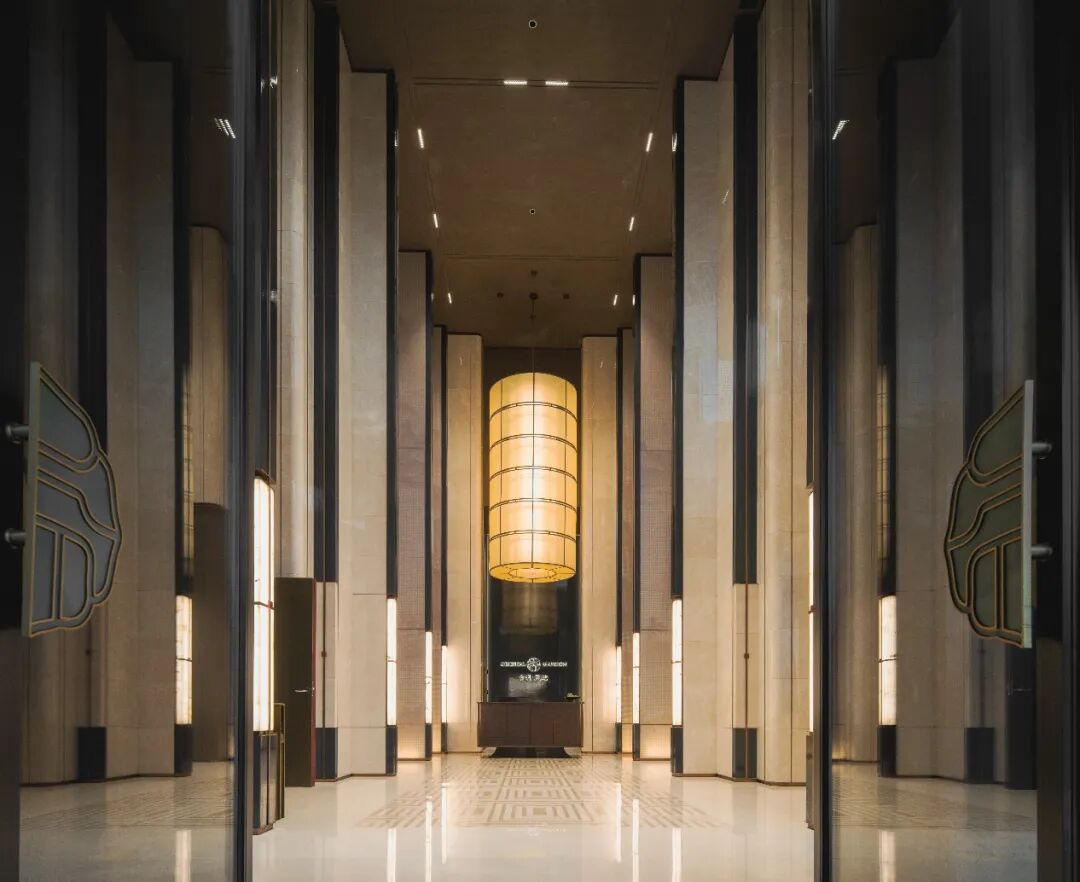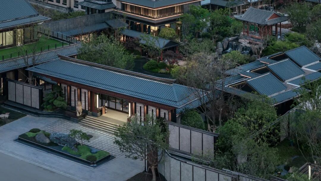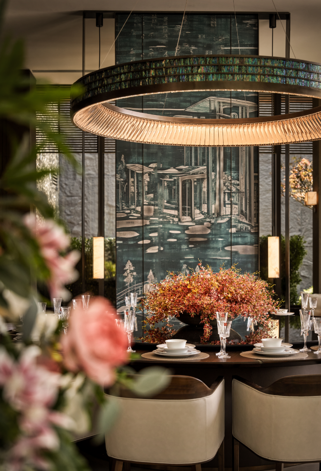 泳池区延续洽谈区主空间的廊柱设计,搭配天花板独特的拱顶取材自湖南大学标志性的拱门,以城市基因组成空间脉络,拱顶设计让灯光柔和地折射在空间中,泳池两侧运用绿植造景营造松弛自然的氛围空间,让宾客能够自在怡然的享受游泳的乐趣。私宴区域布置有游乐休闲区与品茶区,一动一静,充分满足全类型人群的要求。简洁的环形吊灯采用玉石与陶瓷的设计,辅以极简的艺术线条,在现代美学中融入传统的中式元素,艺术墙画强化了空间的质感。保利天瑞建筑风格严整开朗恢弘华美,舒展而不张扬,典雅却富有活力。以木构建筑之形象、明代园林之风韵为基础,取其“形”、“饰”之特色,将概念“骨为今筑。韵以古成”作为项目的出发点,以繁驭简,用现代的手法去表现出古典的韵味。建筑造型上提取传统建筑屋檐之间的形,采用歇山顶、斗拱、屋脊等传统元素,强调横向线条构图,以现代设计手法,转译东方建筑经典美学。色彩上取五行正色为主调,大面运用京元(中性灰)苍艾(深栗壳)茶色(深木色)等传统色彩,辅以薄墨(暖灰)缟羽(浅米白)贴金(黄铜),以珐蓝点睛,形成一幅山水隽逸古朴拙美的画卷。细部上通过不同层数的收口,隽永东方檐下的建筑美学,彰显门第尊崇;窗框勾勒并出挑形成轻盈的取景画框,点睛东方之韵;简化传统中式栏杆,保留中式韵味,大气又不失精致。示范区整体空间设计植根于长沙的书院文化,以园林造景的“起承转合”手法对室内功能进行串联布置,打造华美的中式礼序空间。重点空间天花及地面以保利天瑞的“瑞”字logo为原型,加入传统的中式窗花元素,以现代的材质复刻传统的建筑结构,在现代与古典的交融下,让中式风格迸发出别样的美丽,成为重要的空间品牌记忆。随处可见经典中式元素的当代转译,垂花、长窗、雀替、门环、壁灯、挂落、鸱吻、悬鱼,处处“耑”字纹吉刻,传递着东方的人文厚韵和瑞意盈庭的美好祝愿。