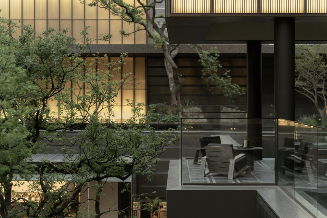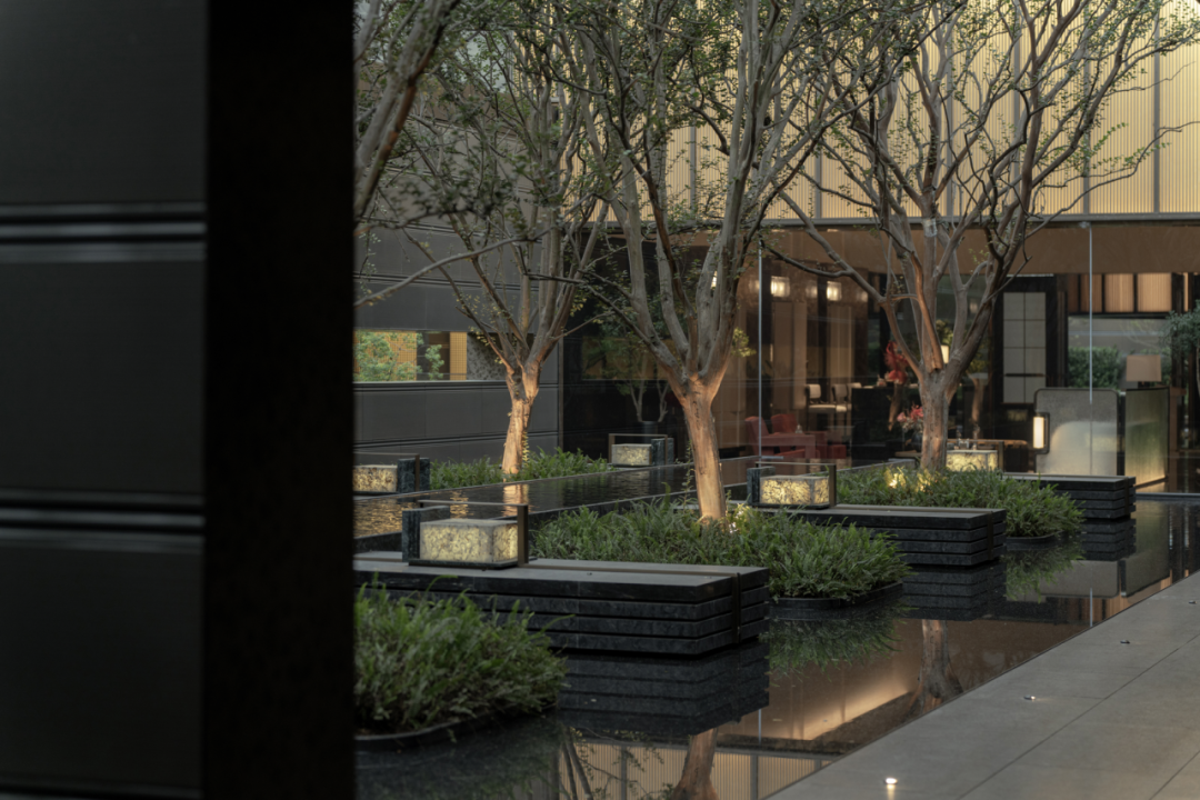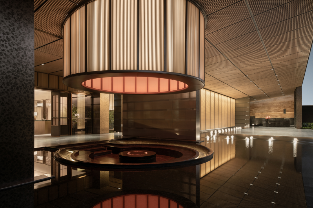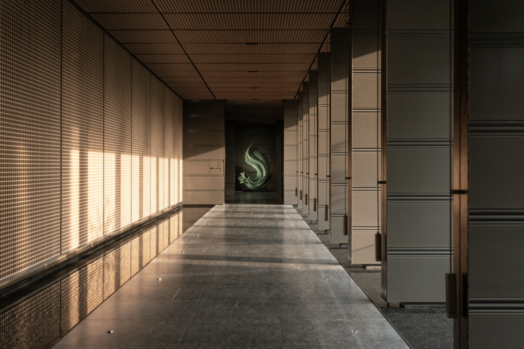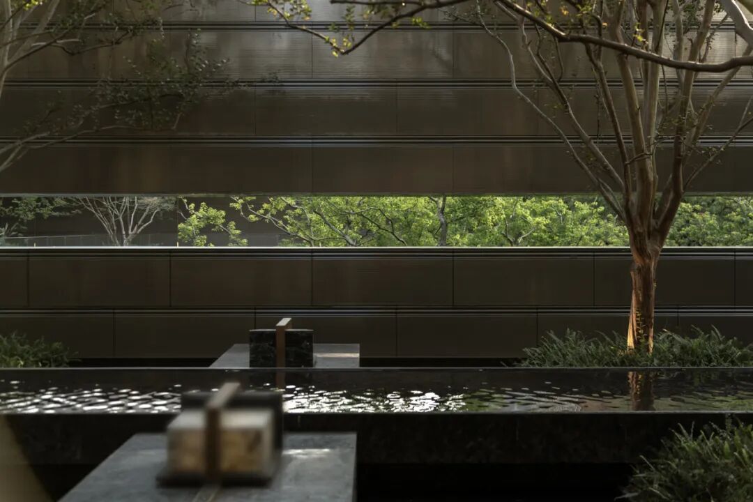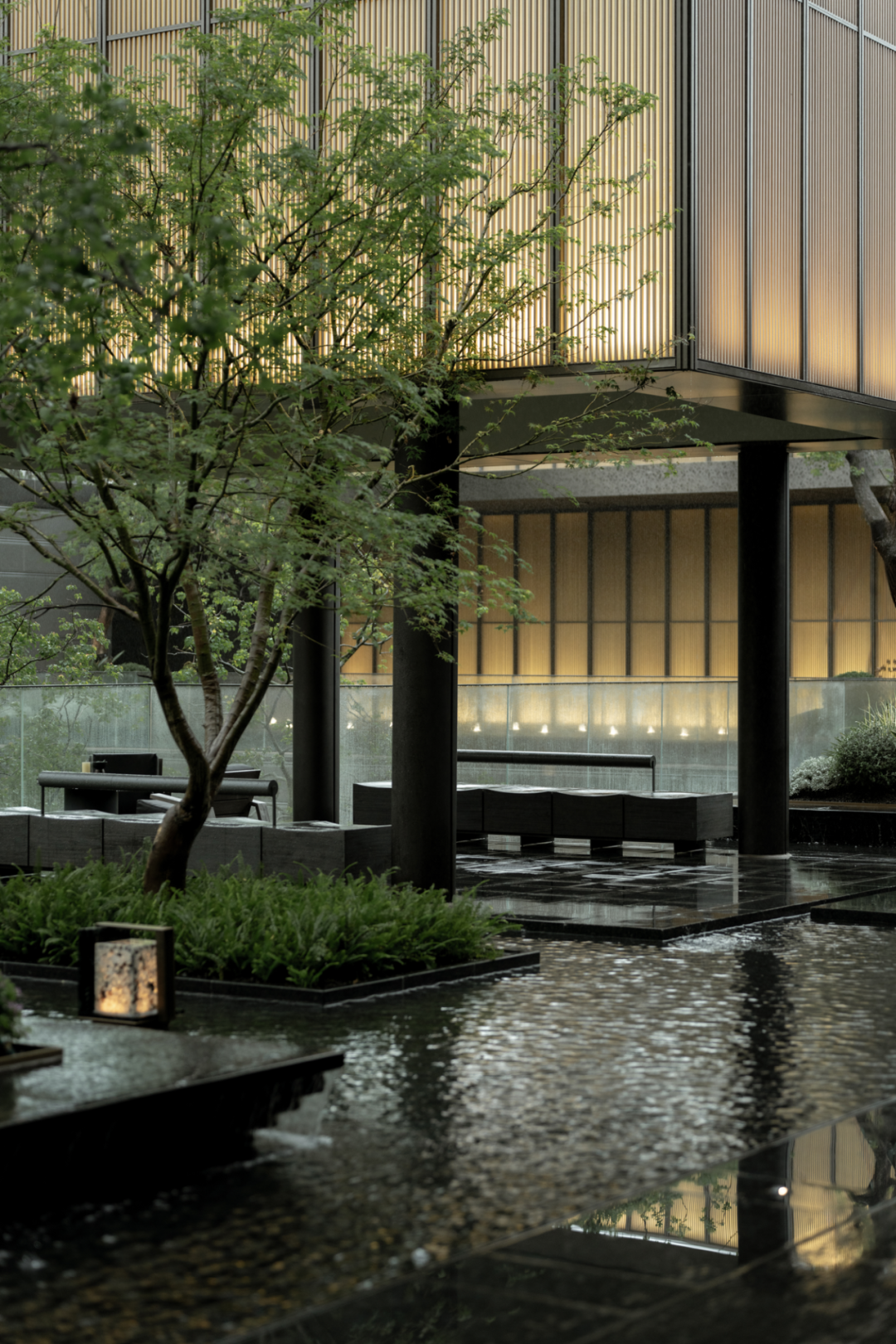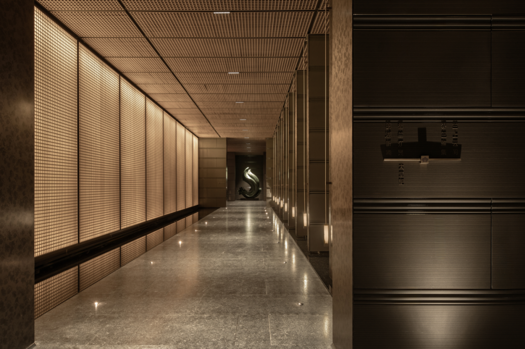 礼序长廊 经过接待区的转场,步入这条度假酒店式艺术游廊,收去繁躁的表皮,内心会自然而然的松弛下来。这条长廊一侧长约30米的格栅、超50万块景格,由数十位匠人历经近1个月手工拼制而成,完美复刻了东京安缦酒店的空间秩序和美学意蕴。