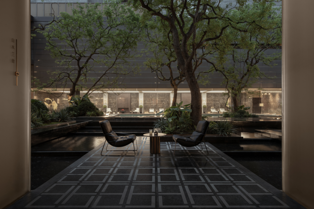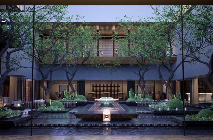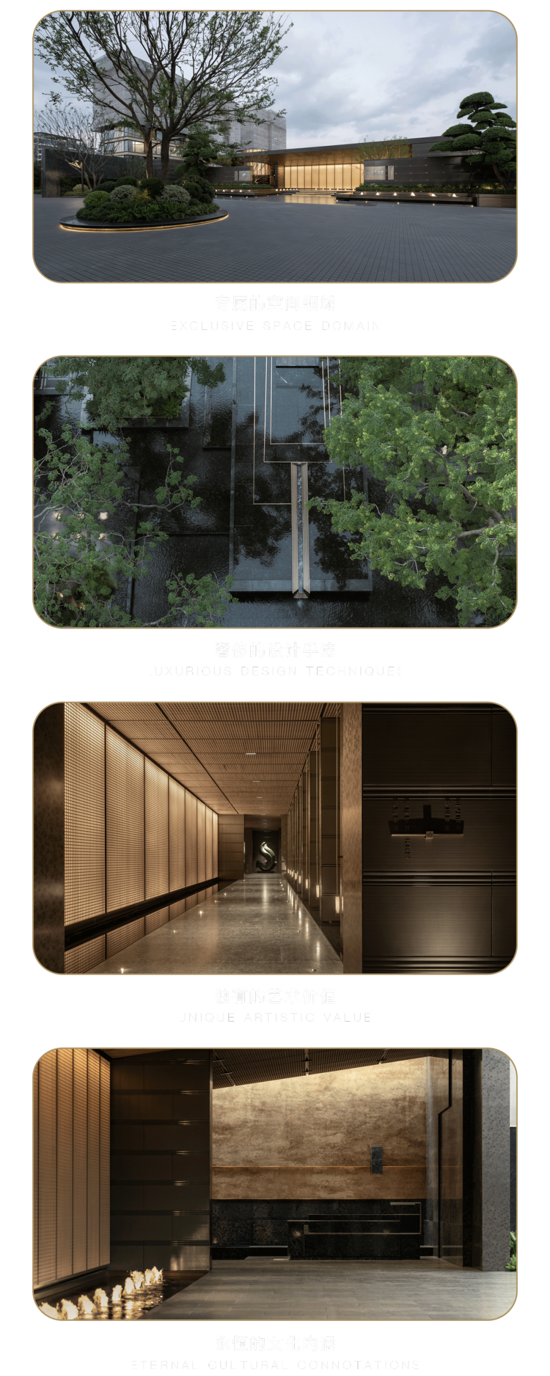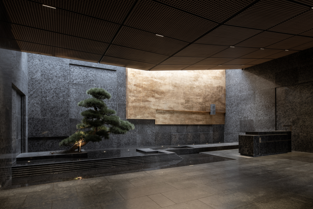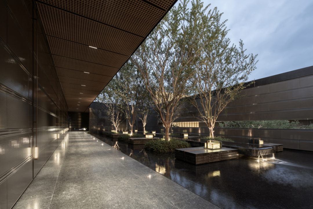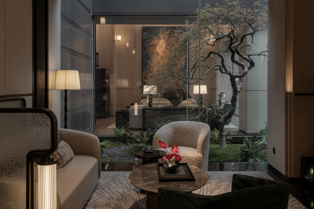洄游水院 泗水归堂,汇聚瑰宝的洄游空间。下沉会所庭院空间突破了平面和室内外的局限,通过室内外和垂直上的空间联动进行统一的动线规划造景,营造出不同视角高端的空间体验感,为室内空间增添了层次与深度,形成自带滤镜的高级感,也是集艺术美学与前沿生活的高定体验。