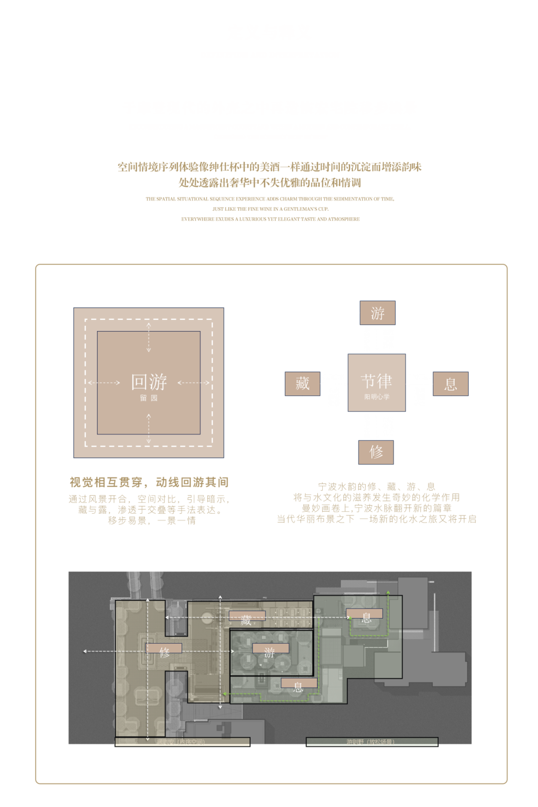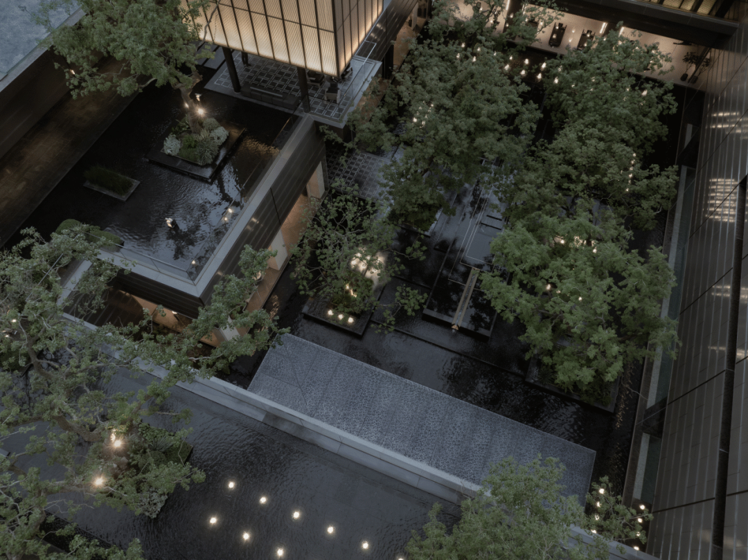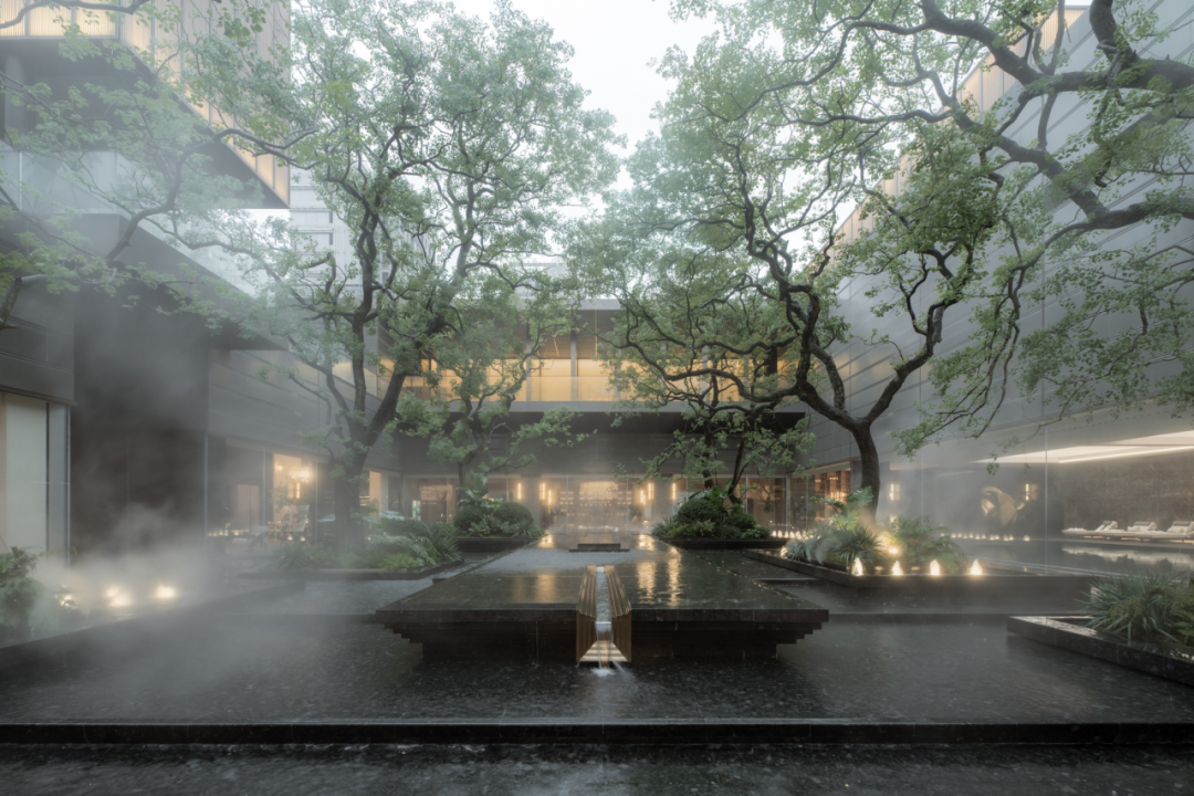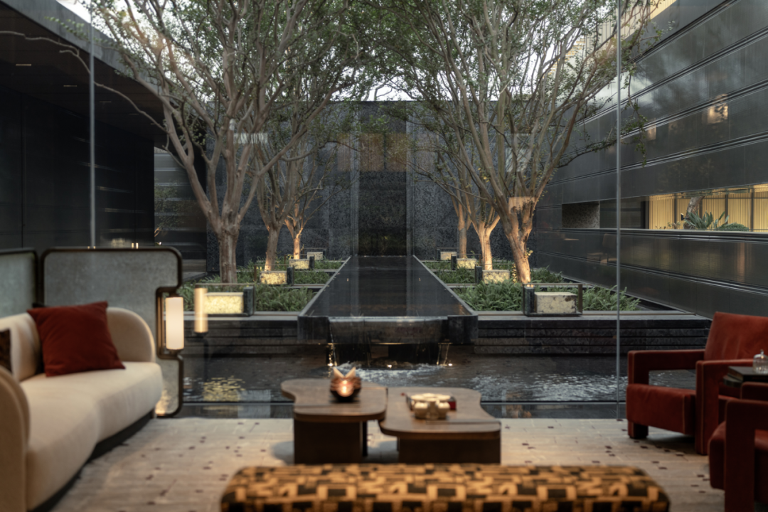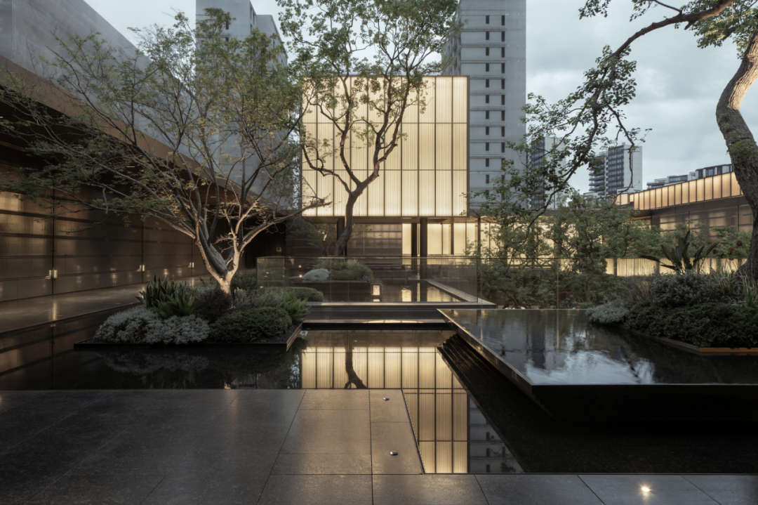 洄游水院 泗水归堂,汇聚瑰宝的洄游空间。下沉会所庭院空间突破了平面和室内外的局限,通过室内外和垂直上的空间联动进行统一的动线规划造景,营造出不同视角高端的空间体验感,为室内空间增添了层次与深度,形成自带滤镜的高级感,也是集艺术美学与前沿生活的高定体验。