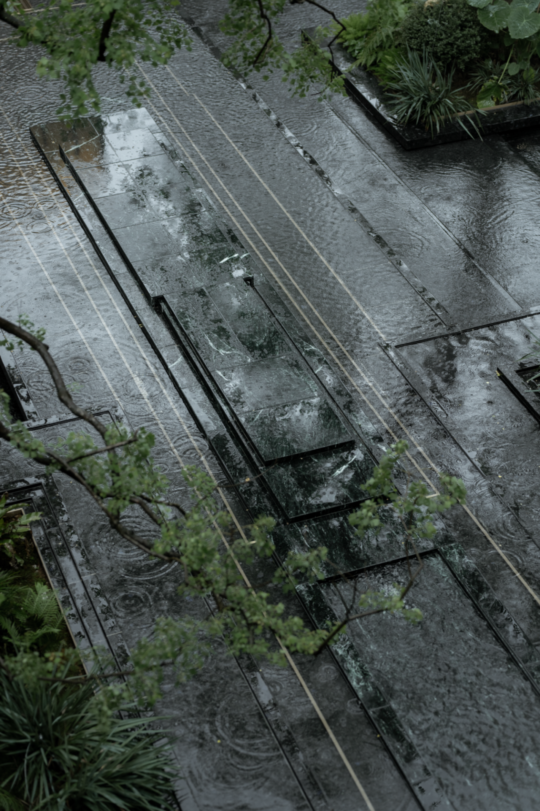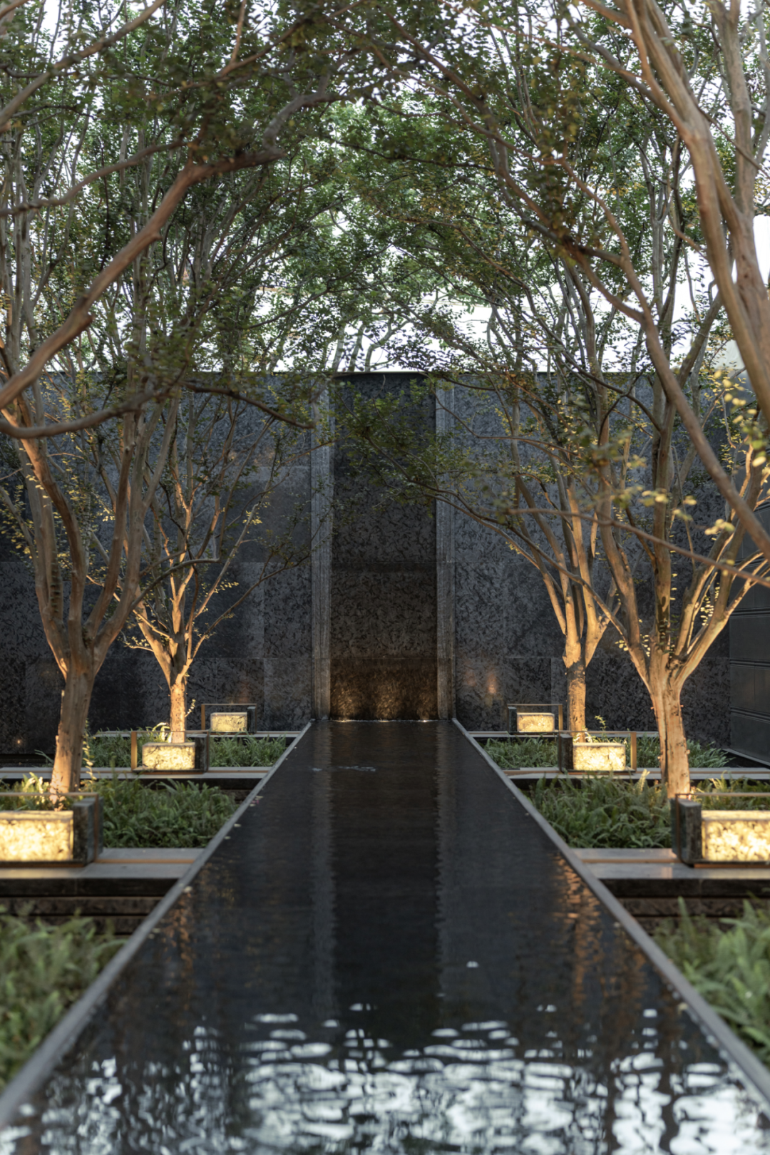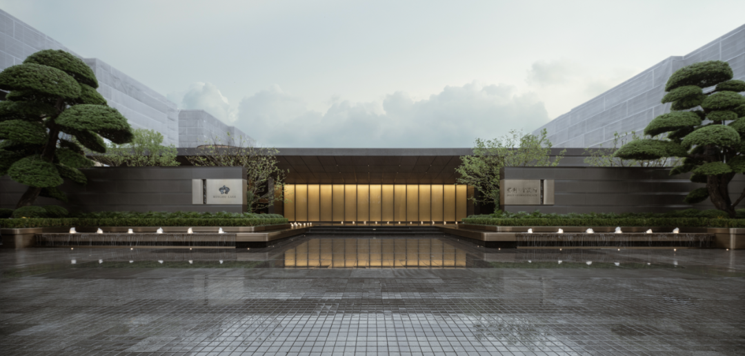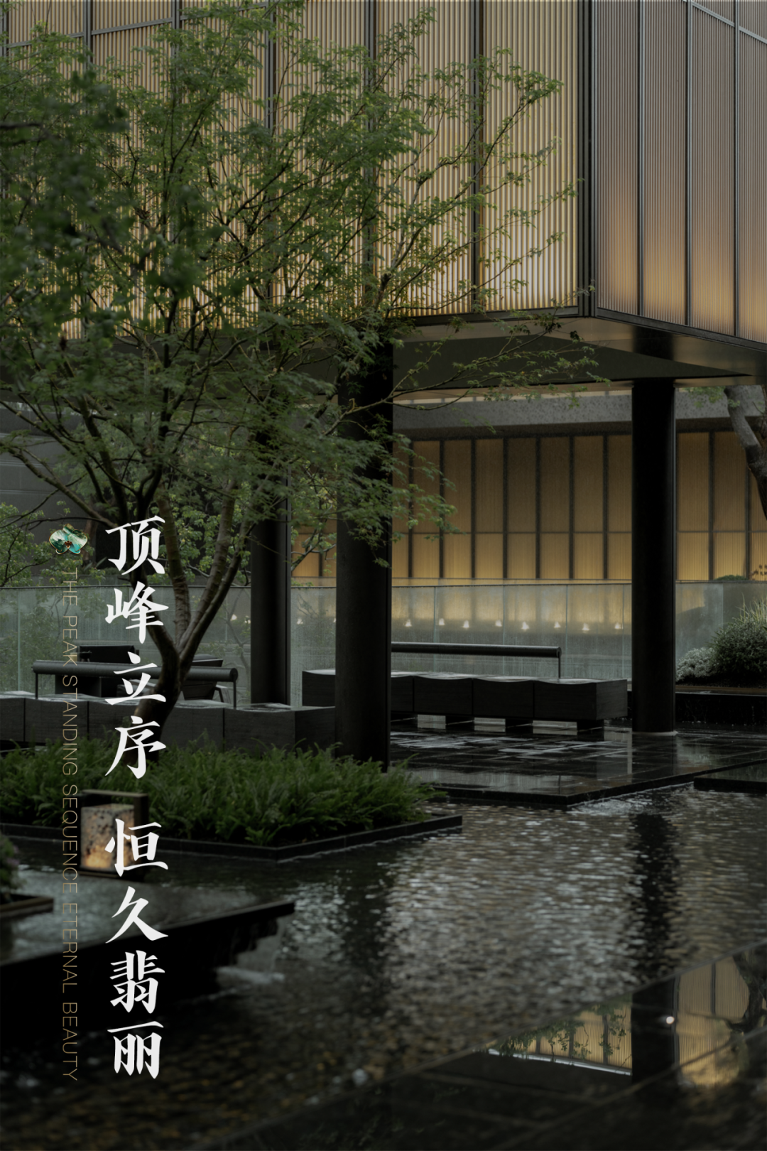 伴水而憩 伴水而息,知停而行;一笔带下的镜面水景,是采用黑色奢石进行铺贴,这是体感能触摸得到的质感;远处的亭榭,转译着归家的温度与适从,借树梢上的一缕清风,浸润内心的疲乏。将空间留给自然,缔造一个纯粹的宽境生活。