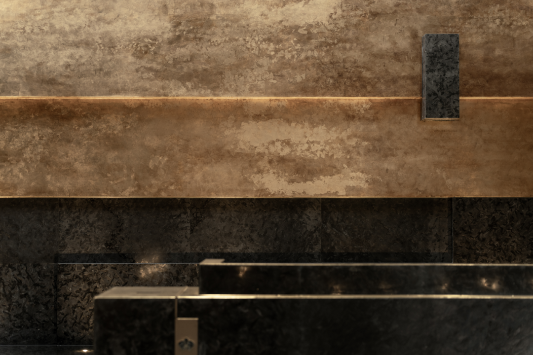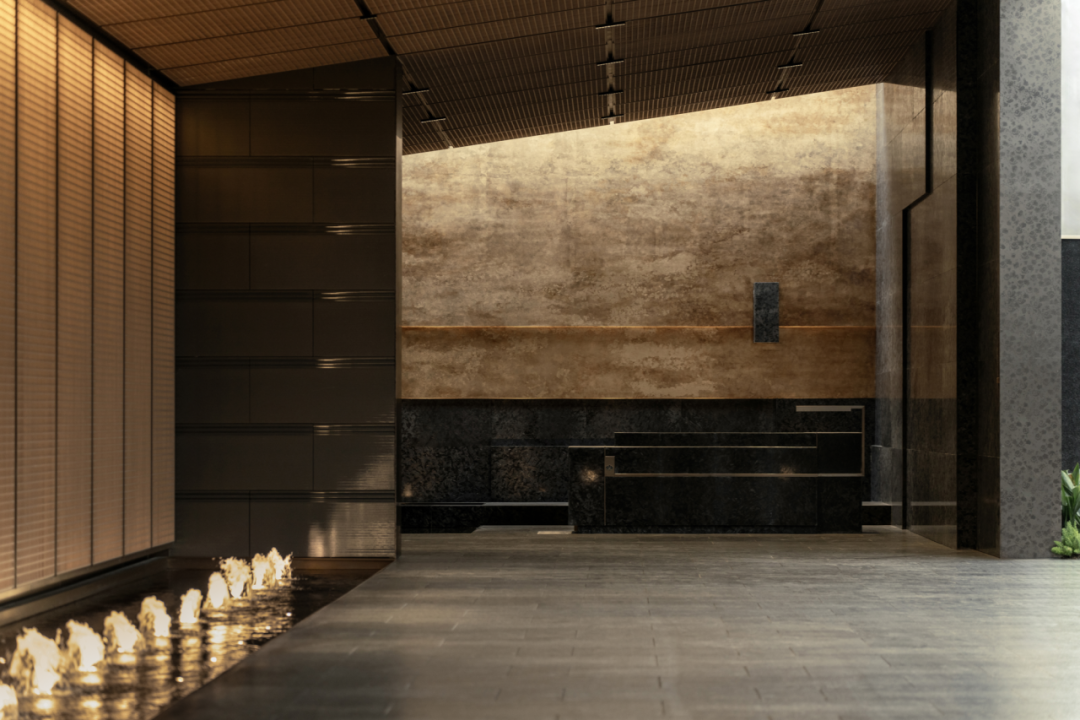 大门另一侧是迎宾接待区,由非遗工艺打造的金箔墙,由经验卓绝的老师傅纯手工打造而成,金箔是东方美学的传承绵延,以浓墨重彩的文化气息,盛迎业主归来。
