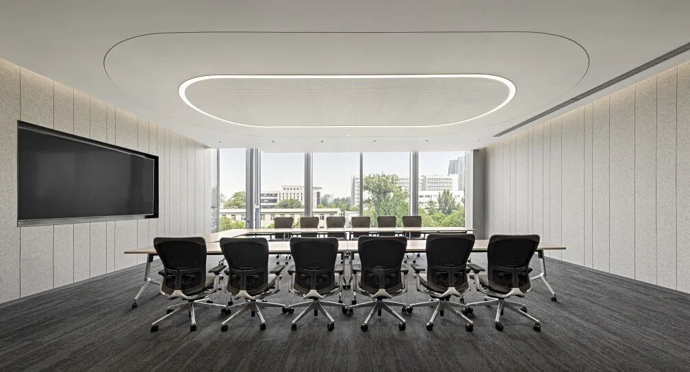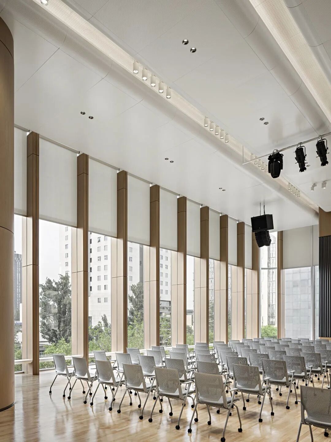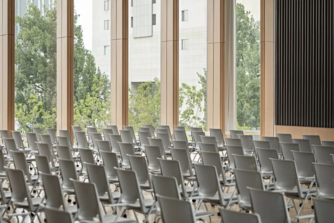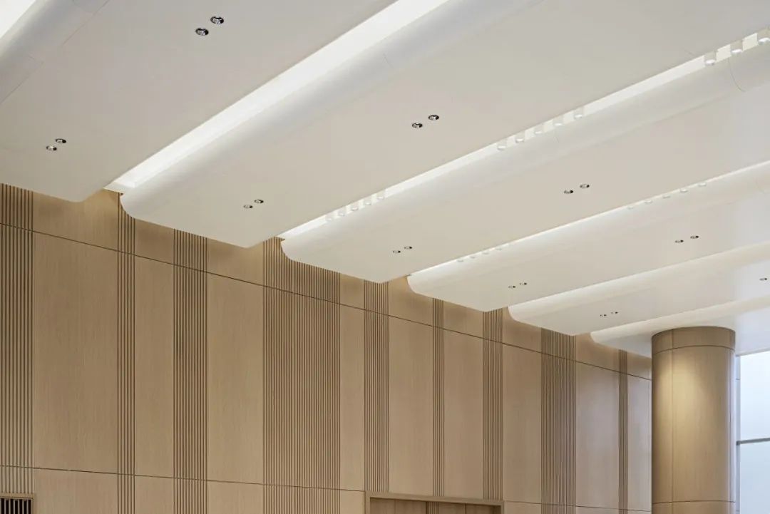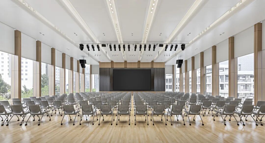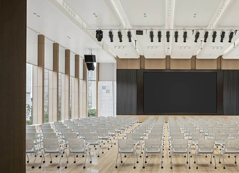 多功能廳層高7.8米,墻面采用木紋微孔吸音鋁板,為報告廳增添了自然與溫暖的氛圍,其微孔設計有效提升了吸音效果,確保聲音在室內的均勻傳播,避免回音和噪音的幹擾。