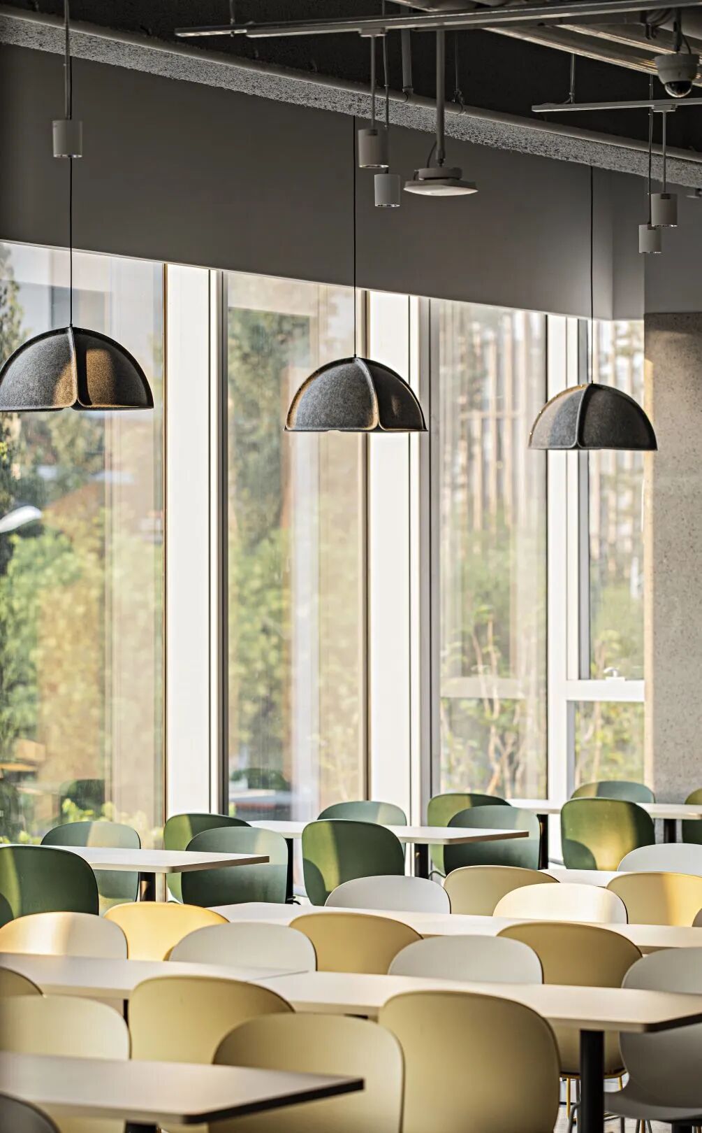 螞蟻T空間的色彩體系構建,靈感源自「螞蟻莊園」、「螞蟻森林」、「神奇海洋」、「螞蟻科技」四大板塊,由此衍生出棕色系、綠色系、淺藍色系、螞蟻藍四大色彩體系。這些色彩體系被巧妙地運用在辦公樓層的不同區域,包括吸音板拼塊墻面、工位隔板、會議室聲學墻面以及休閑區,通過同色系的跳色搭配,形成了視覺上的和諧統一與辨識度,為整個辦公空間增添了獨特的文化活力。 在餐廳設計上,也將色彩的設計理念一以貫之,以「生態融合、雅致溫馨」為氛圍營造,汲取自然靈感,提取色彩元素作為空間的主題色,與木色相融,營造整體空間。