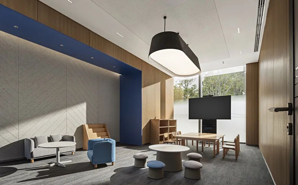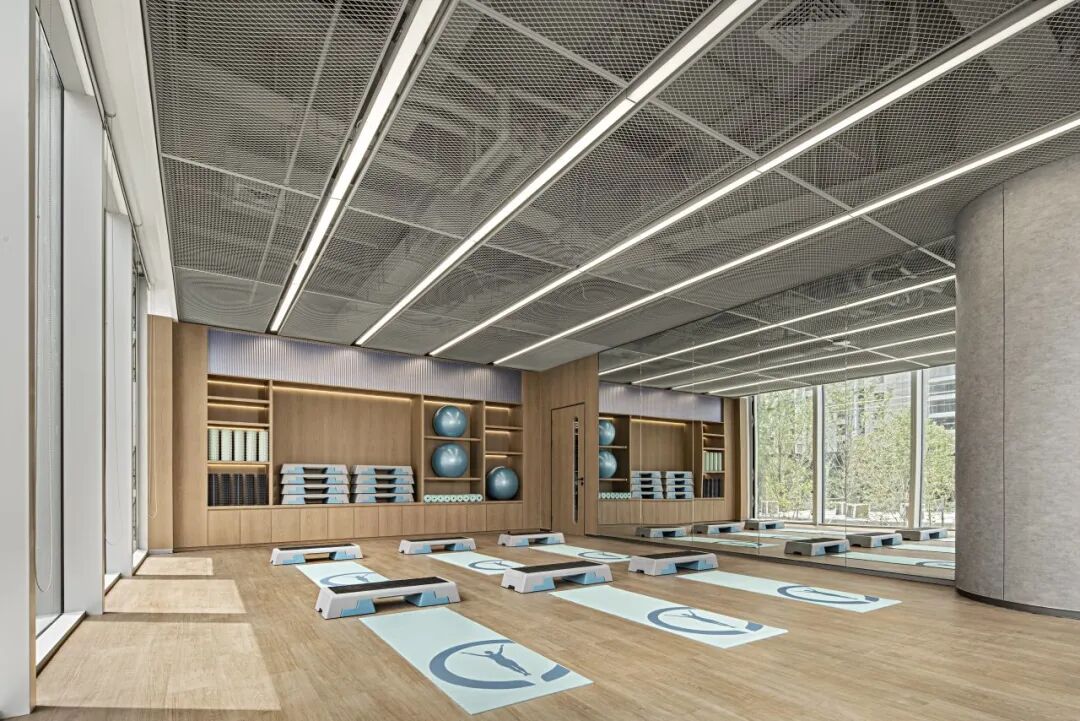 ·瑜伽室. 瑜伽室配備專業的器械,人們工作之餘,可以在這裡找到內心平靜的力量,積蓄心力。藍灰色的健身器材與低飽和的木紋墻面形成鮮明對比,溫暖和諧的同時表達了積極明快且沉浸式的瑜伽氛圍。