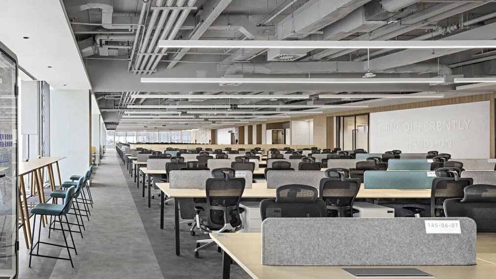 因定義為科技創新型空間的屬性,在標準辦公層,採用了「舒張結合」的策略,用無柱式辦公空間,為團隊提供靈活多變的辦公佈局,矩陣式佈置的開放工位,氛圍簡約、明亮、溫馨、溫暖。