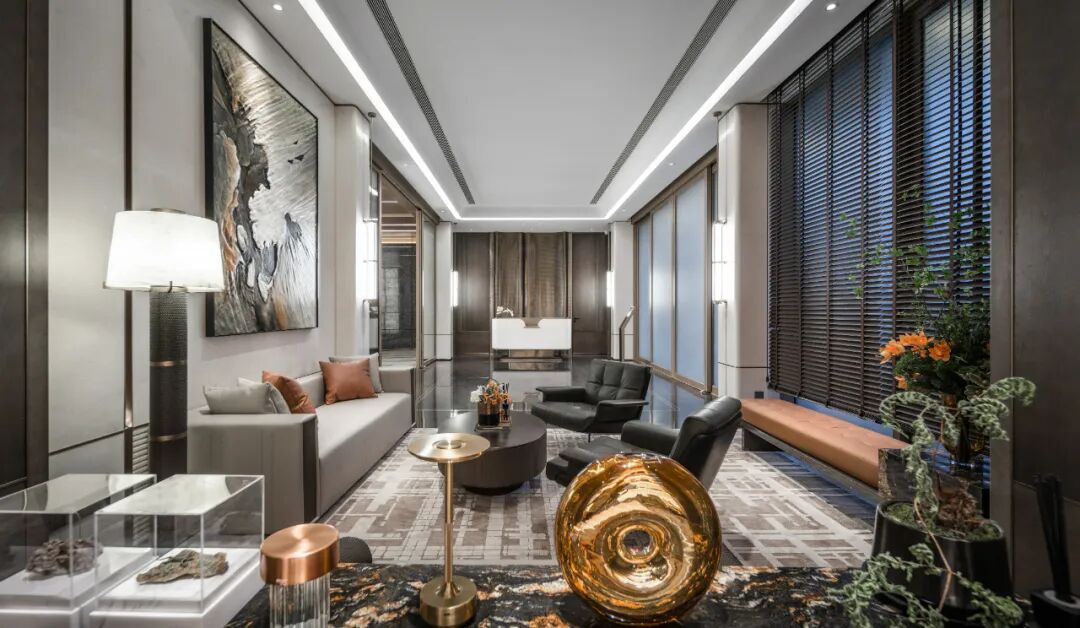 约80米景观长廊有序展开,会客廊架、花池、水景、坐凳等立面细节,运用了大量的普拉达绿奢石、蓝黛灰大理石、宇宙风云奢石……独特的石材纹理就是天然的印象派绘画。