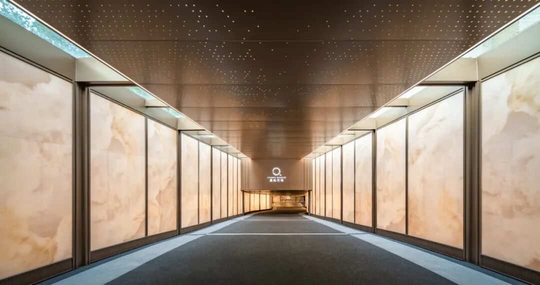 又以印度绿奢石铺就一条“艺术之路”,手工打磨的石材质感被完整保留了下来,富有记忆点。