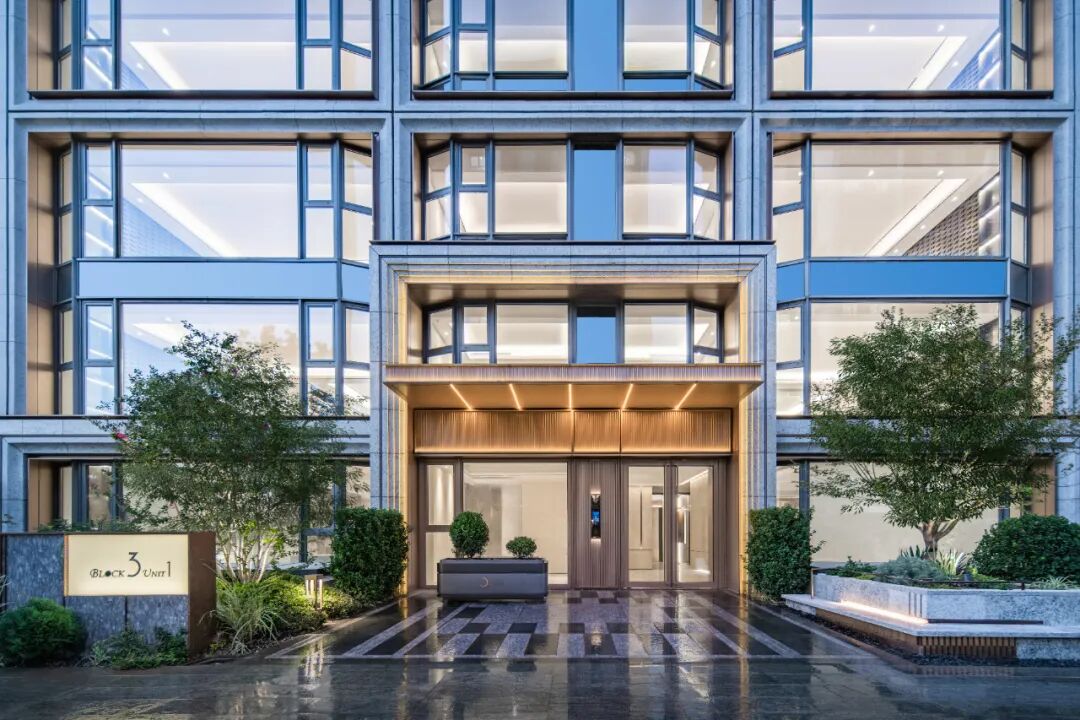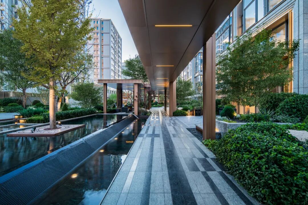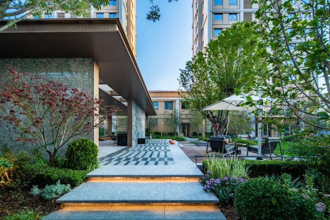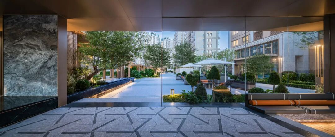 入户空间以低矮的艺术景墙结合绿植墙、乔灌组团等,层次丰富,充满序列感和仪式感。