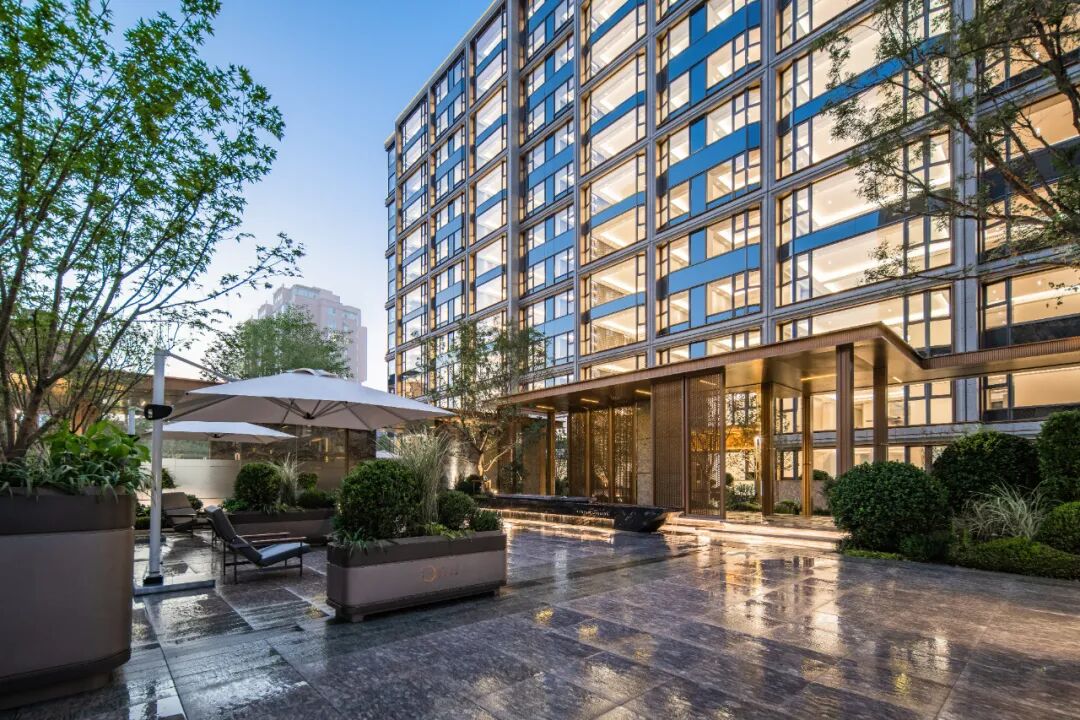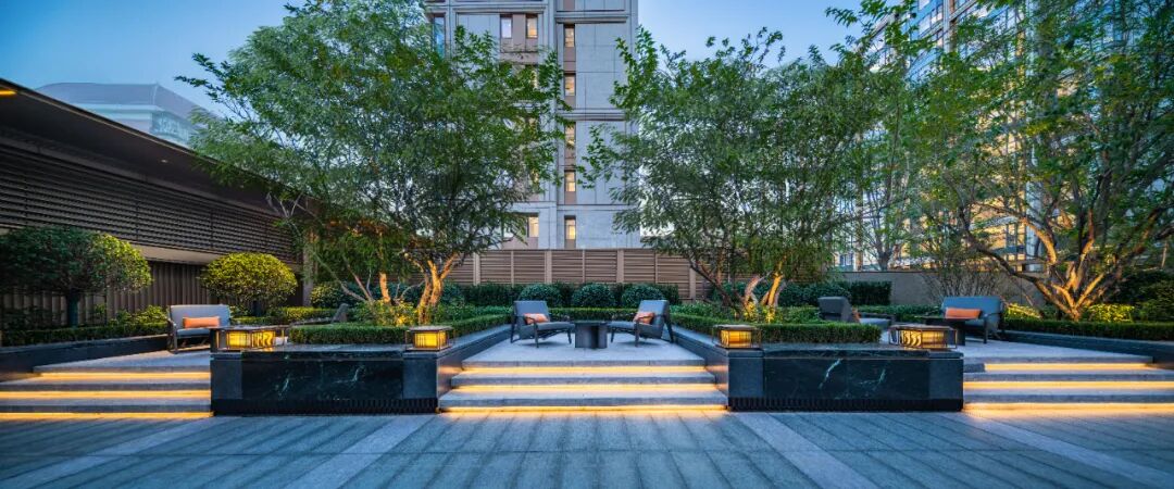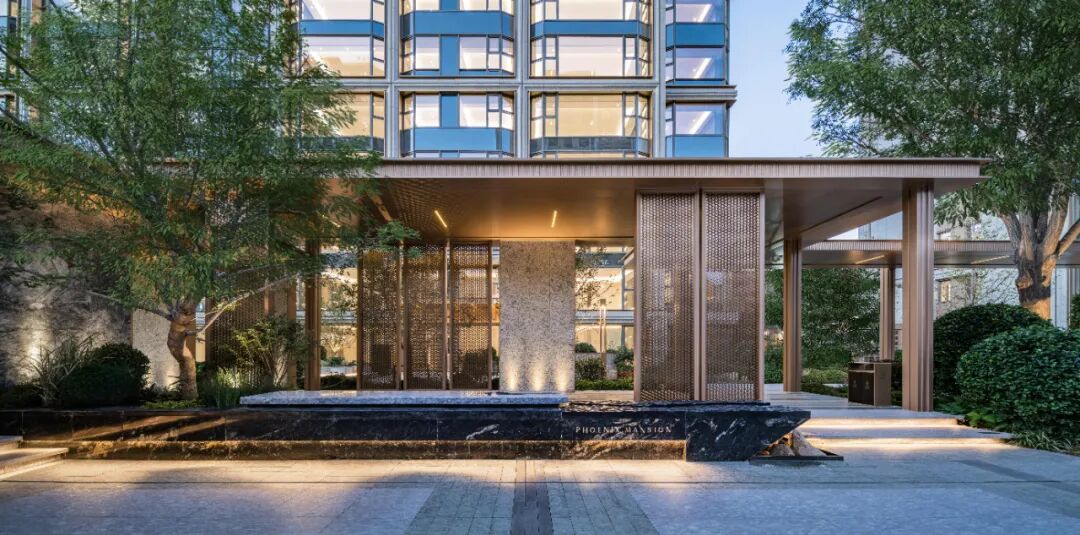 以艺术墙体结合格栅、金属嵌条、跌水、灯光等营造高级感,在精选乔灌木的点缀下,将艺术与自然充分融合。 退后城市道路,形成度假酒店式落客区,又利用半隐照壁和入口与市政道路保持一定的距离,充分诠释了什么叫做“大隐隐于市”。