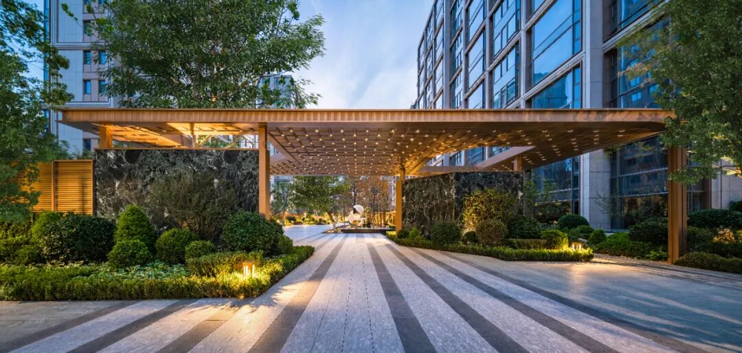 细致入微的设计理念还在于,对南侧两个地库廊架通过实体景墙进行围合,结合格栅、金属线条、灯光等元素,营造户外休闲空间,让园区的每一个角落都呈现优雅的视觉感受。