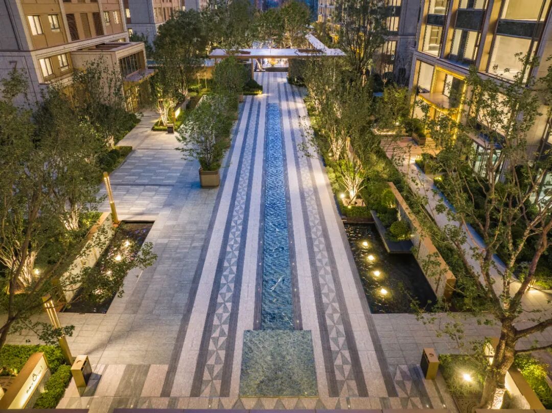 以艺术墙体结合格栅、金属嵌条、跌水、灯光等营造高级感,在精选乔灌木的点缀下,将艺术与自然充分融合。