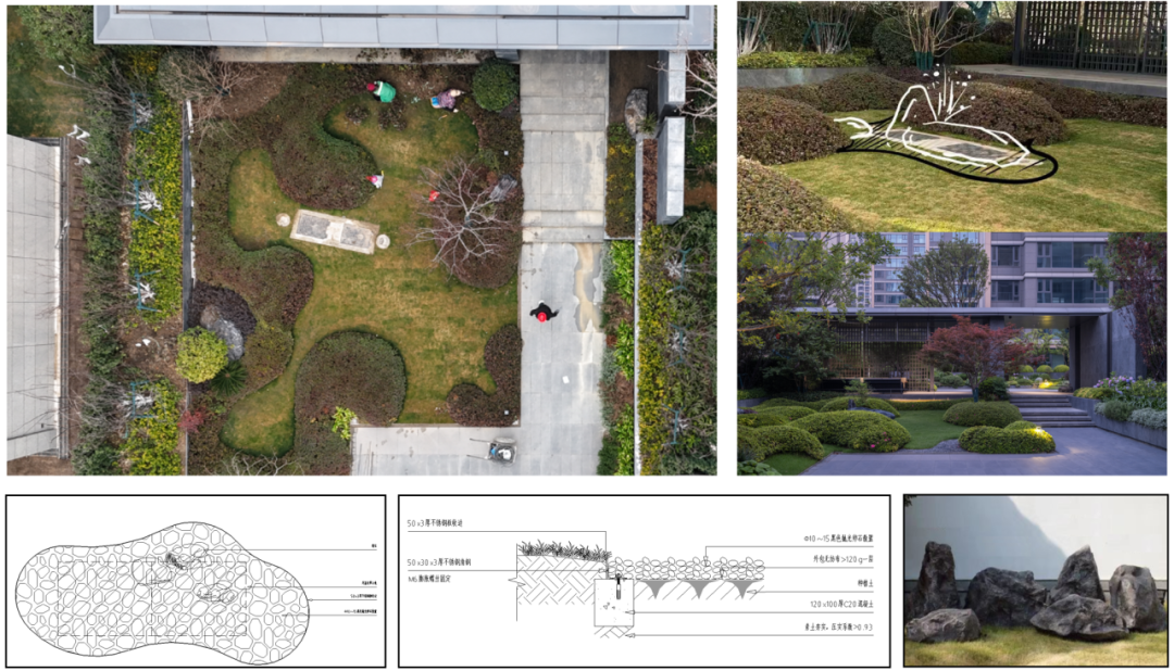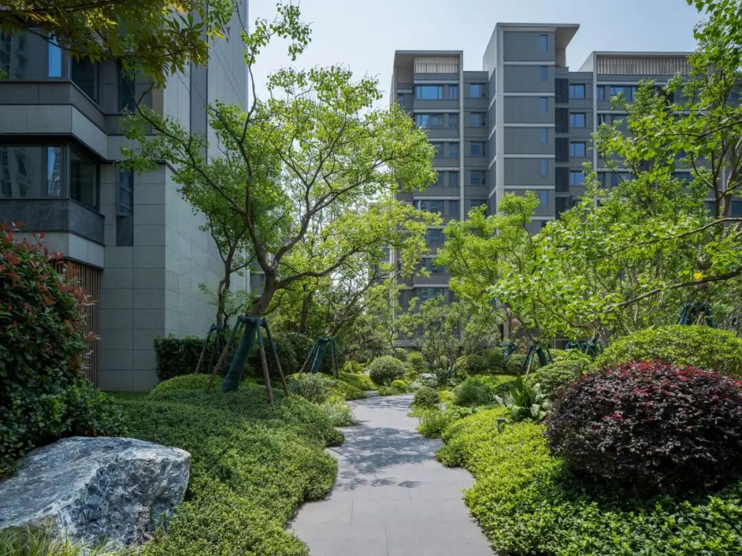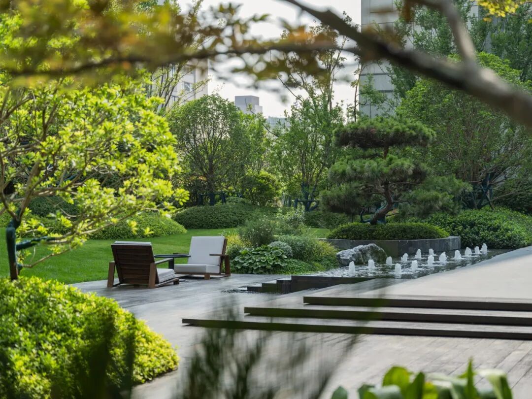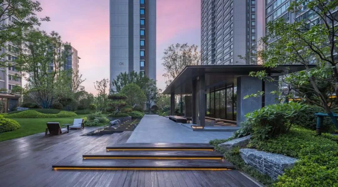 简远疏朗、雅致天然是珺悦园林的气质。曲折的小道,模拟着山林溪谷的蜿蜒,行至樱林夹的道尽头,松石水景收束了前半段曲折转圜的归家动线,循着水声向前便是豁然开朗的核心景观区。 斑驳的乌桕树影投影在丘陵起伏状的草坪之上,松石映照的涌泉背后,是风颂雅庭下的品茗长桌与下沉卡座,在更加匍匐的视角下,人与自然的距离得到拉进,业主可以在此听雨、赏雪,亦可以在此在侯月、观星,体会四季更迭中清风明月与我的禅境。