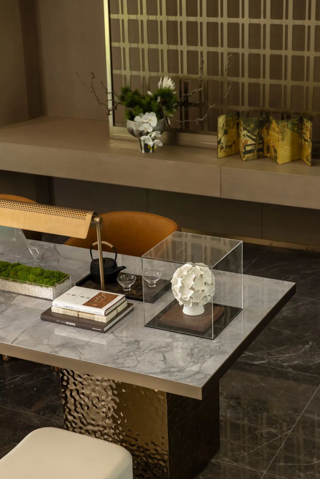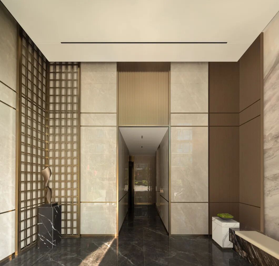 地下大堂延续地上大堂的风雅稳重,国风背景岩板取自徽砚石纹,墙面地面的瓷质铺贴暗合宋瓷冰裂纹的极简韵律,以安徽歙砚演变构建的金属屏风贯穿地上地下大堂,仿铜不锈钢收边如古画装裱的锦带,让业主在进门的第一步便踏碎现代喧嚣,跌入宋式栖居的静谧。