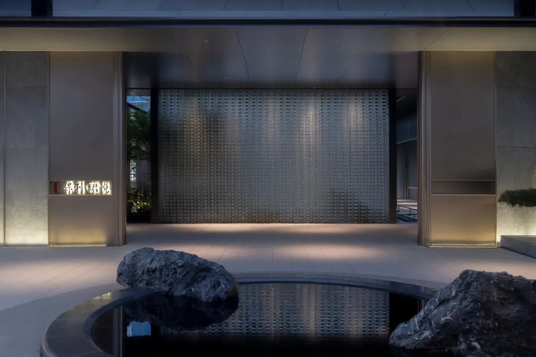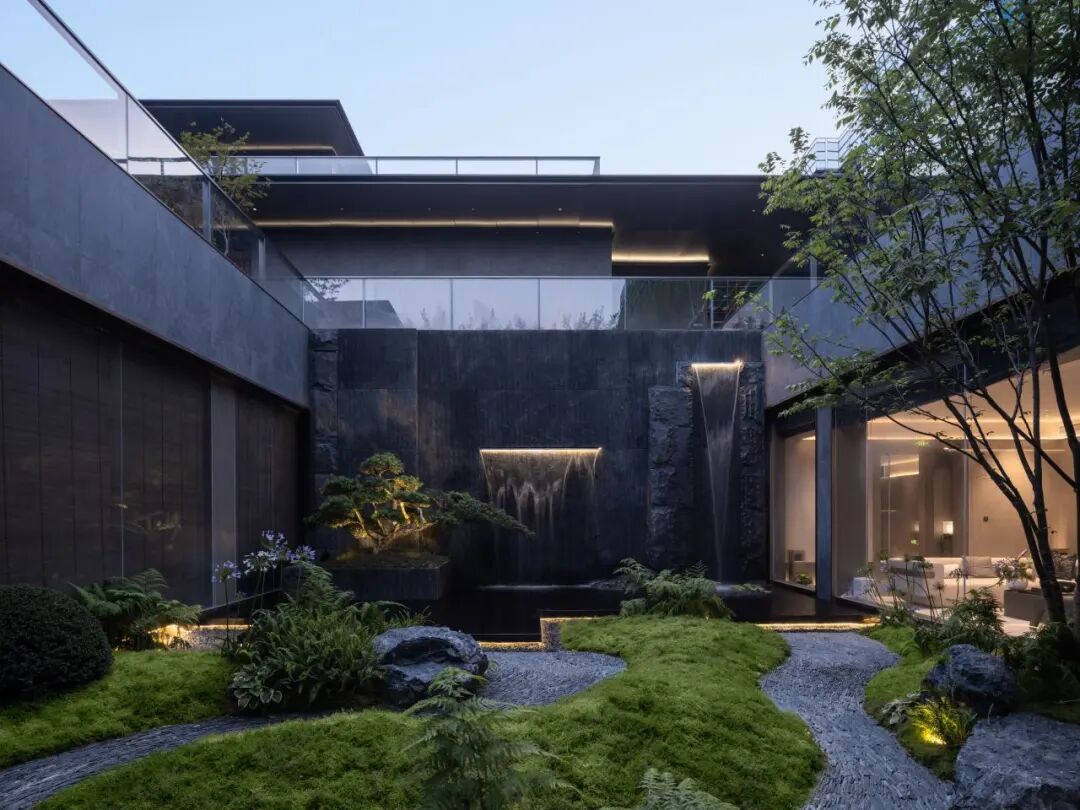 门是庭院的起点,犹如戏剧的序幕和文章的开头。珺悦舍弃繁琐的语言,以方、圆为基础设计语言构件前庭门头,两侧丝网景墙结合涌泉,辅以对称布局的黑松迎客归府,玻璃照壁透光映景,映衬出背后水院的林影婆娑。