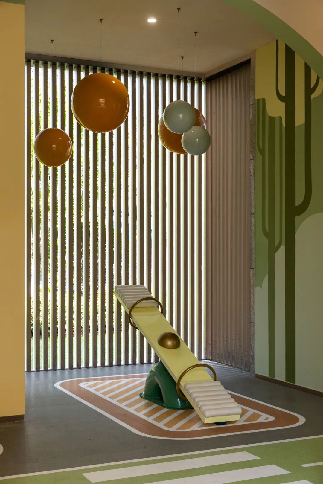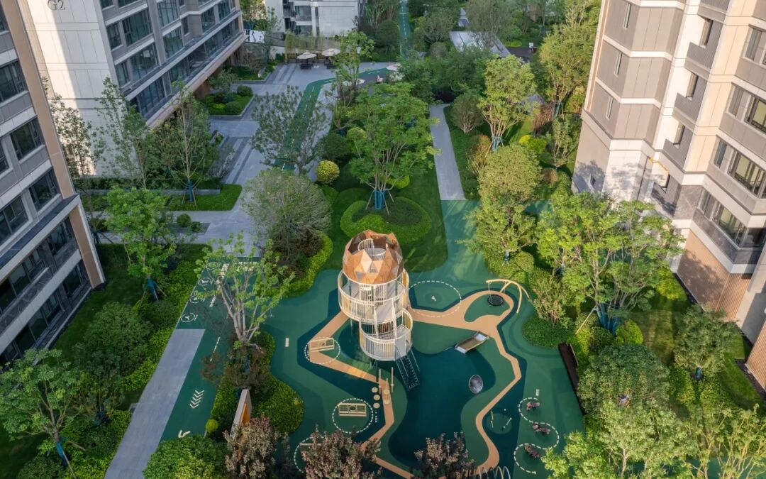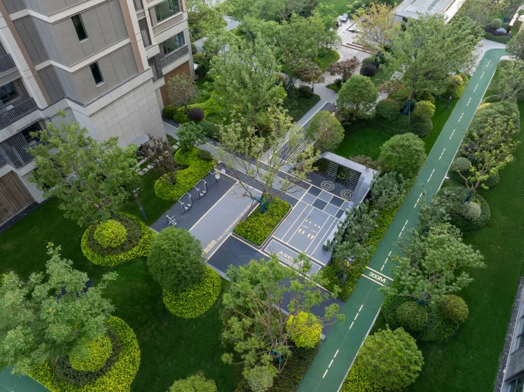 室外活动区的配色选择与室内氛围暗合,低饱和度混色地垫及仿木纹活动器械构成室外场地的色彩主旋律,同时将宋朝时期儿童的蹴鞠、骑竹马、推枣磨、水秋千等演绎到场地中,周边采用无刺无毒的植物围合空间,多重植物层次搭配冠大的落叶乔木,打造“触摸四季,安心撒欢”的活动空间;儒林致远活动区则以低分枝朴树为中心,为业主提供多种康体设施的同时,配套座椅、挂衣钩、水杯架等人性化细节设计。