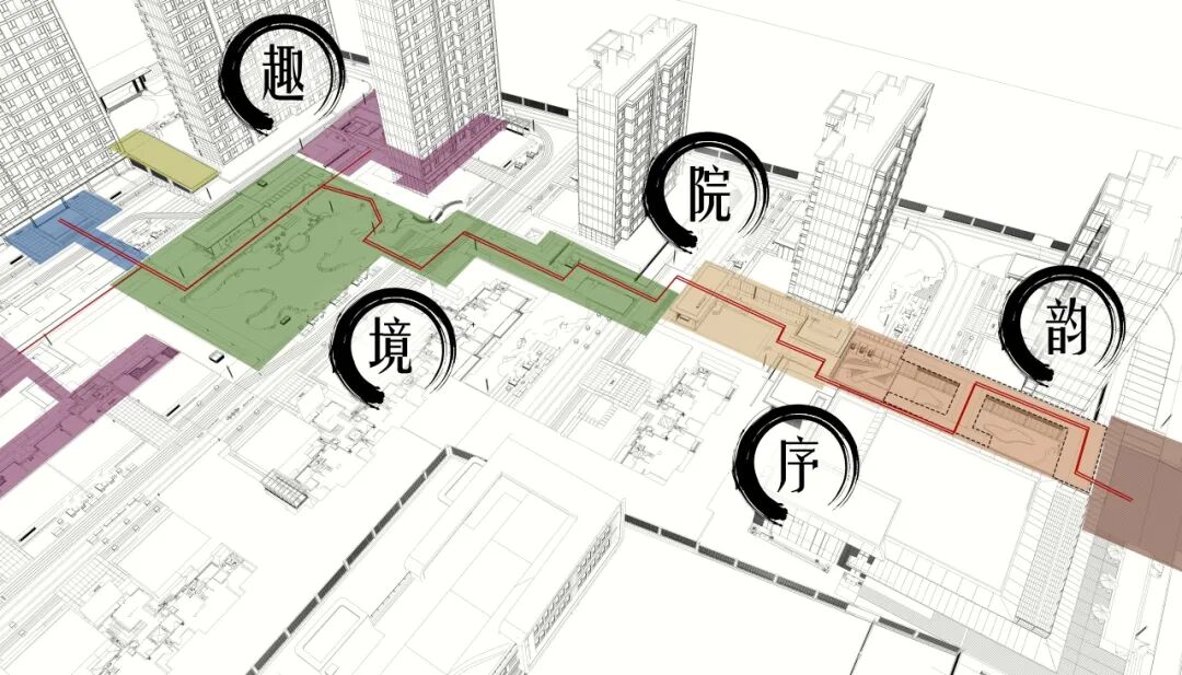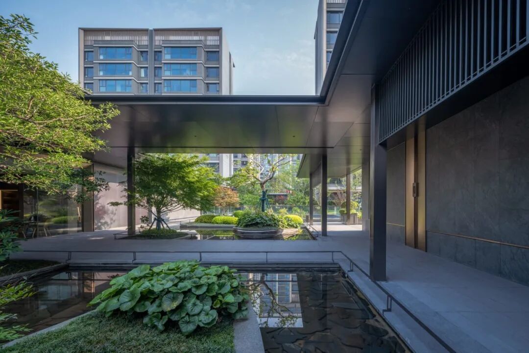 在整体空间规划上,根植于传统东方意境,以空间为骨,寻脉江南传统私家园林空间营造的的起承转合,打造“韵、序、境、趣、院”的五进空间。同时将现代人居生活行为融入空间功能的组织构建中,取法南宋刘松年《西园雅集图》,以画景还原的方式,打造“礼序前庭、廊桥映画、立境鉴璞、林庭雅颂、全龄悦活、双堂归礼、星耀归途”七种雅境,演绎全新东方山水的叙事空间。