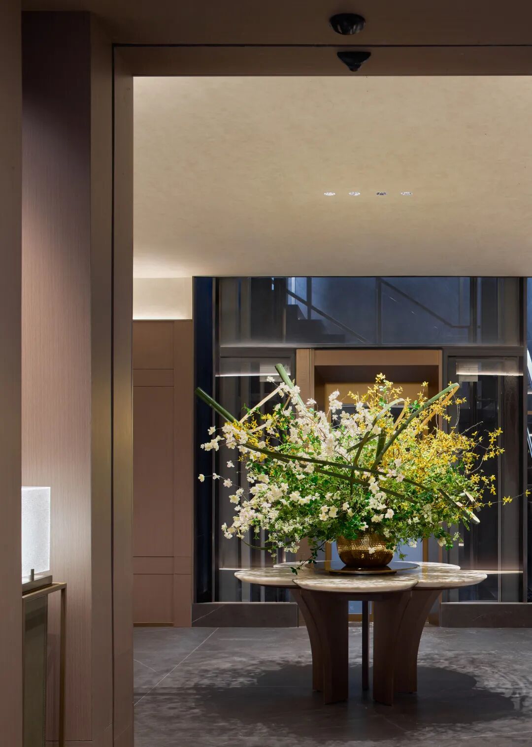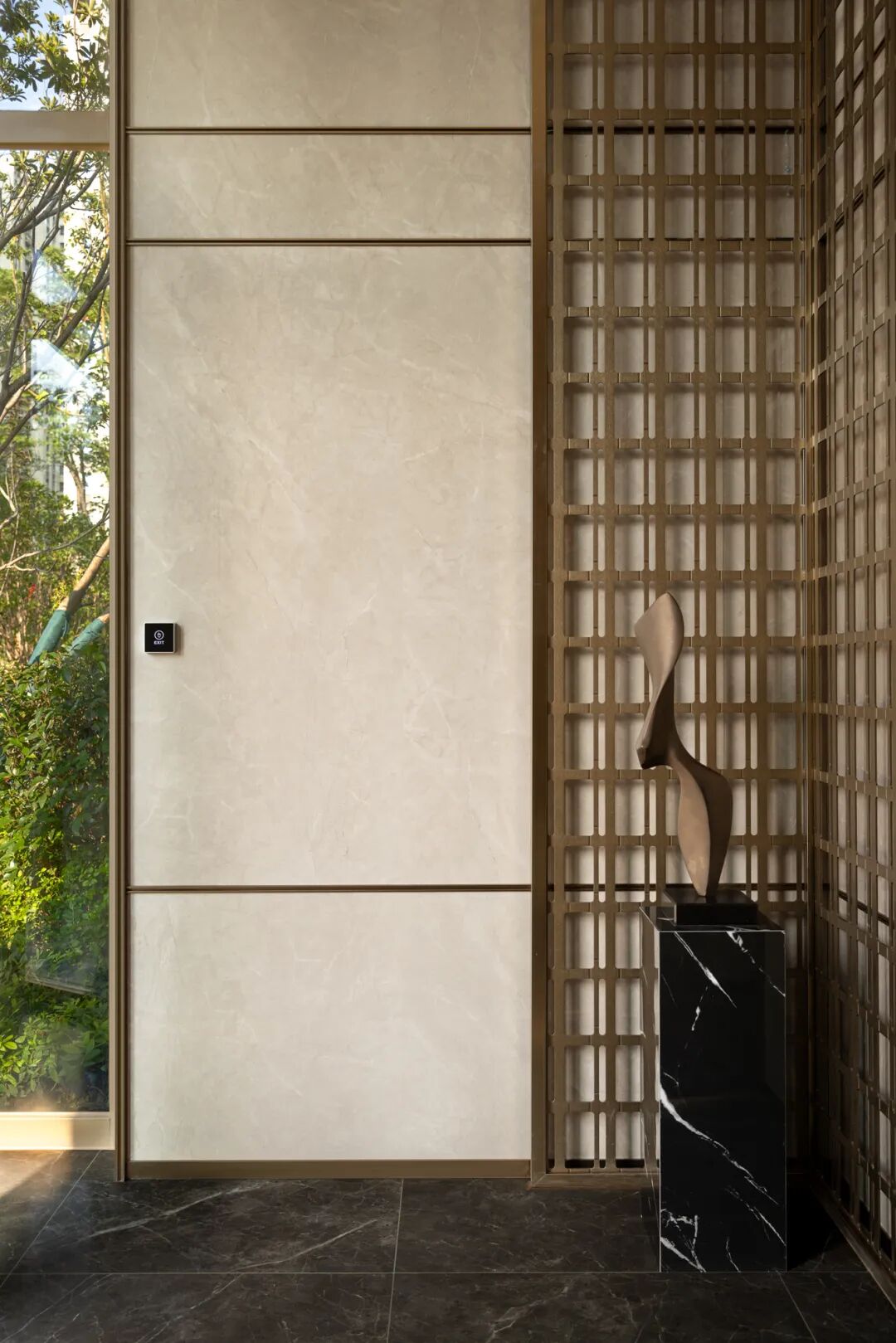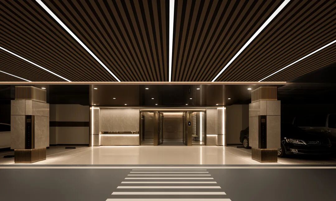 从地上归家的礼序到地下归家的精微,珺悦用贯通式的灯带、马蹄石坡道地面、定制发光标识、山水云纹岩板与香槟金格栅板为地下动线营造慢慢仪式感。“地库玄关”采用格栅立面及不锈钢吊顶,以水墨岩板为底,搭配搭配定制标识,营造出强烈的精神昭示性,如一场盛大的归家仪式,庄重而温馨。