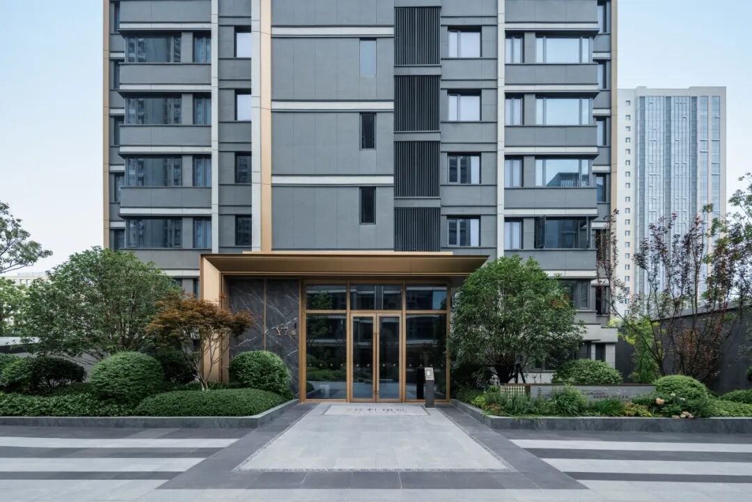 门堂藏山水,栅影展归序。入户景墙主题诗句延续悦系的风雅意韵蕴,配以“砚台纹”定制灯箱,石材的自然面肌理掩映在长效花境中,宋风纵深挑檐两侧是“有花有绿不遮挡,芬芳挂果四季赏”的植物组团,香槟金不锈钢电动单元门搭配定制“回龙纹”捶打执手,定制可视对讲以仿石岩板为基底,点缀香槟色回纹装饰,整体场景语言统一、气质协同、雅致简远,开启私属专享归家。