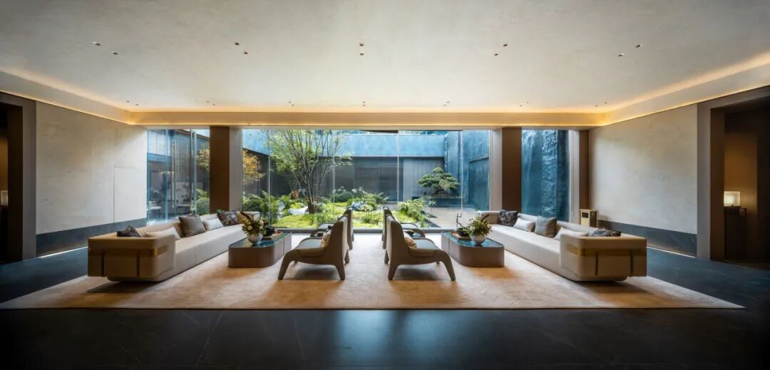 结合一进礼序前庭序列庭院空间,联动无雨归家动线,设置下沉私属归家会所。巧妙利用室内外和垂直上的空间联动进行统一的动线规划造景,营造出丰富的园林空间体验感。会所内设健身房、瑜伽室、书吧等私享空间,提供私密高端社交场所空间。围绕景观下沉庭院布置,透过大面落地玻璃,享庭院美景,呈和谐建筑之美。