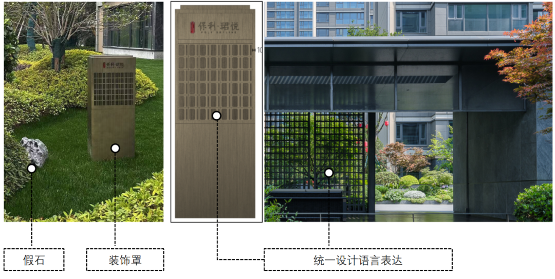在场景融合之外,珺悦项目各专业对细节极致追求,不论是幕墙园林的色温统一、室外管井的多途径隐藏、消火栓的定制美化,防撞角的精细化设计,配电房美化等,让品质“润物细无声”。