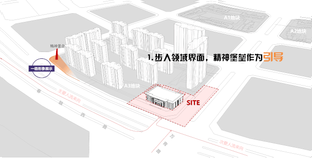 首先,项目场地紧邻主干道,从主要人流来向处打造三级形象展示面,逐步引导人流进入场地。其次,打造展示面,引入前场,最后进入展示区,场景化的景观带来强烈的的视觉感受。
